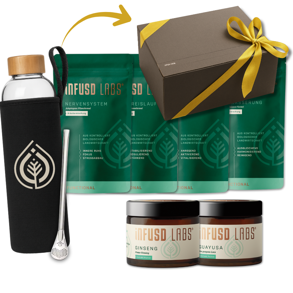 Infused Labs - Nervensystem: Melissenblätter*, Passionsblumenkraut*, Lavendelblüten*, Ashwagandha-Wurzel* (Withania somnifera), Taigawurzel* (Eleutherococcus senticosus), Ginseng-Extrakt, Buchublätter*.