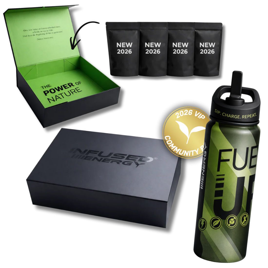 Wir bringen dieses Jahr 4 neue Infused energy Infusions raus – und wir packen sie alle in eine einzige, limitierte Box: die 2026 VIP-Community Box.